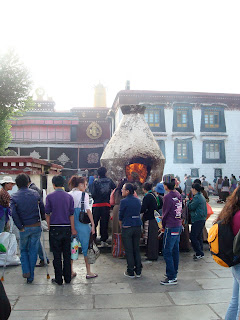 Outside people repeatedly prostrate themselves in front, and pilgrims making the circuit will occasionally pause to throw bits of barely and juniper branches into giant incense burners who's pillars of smoke would rival any bonfire.